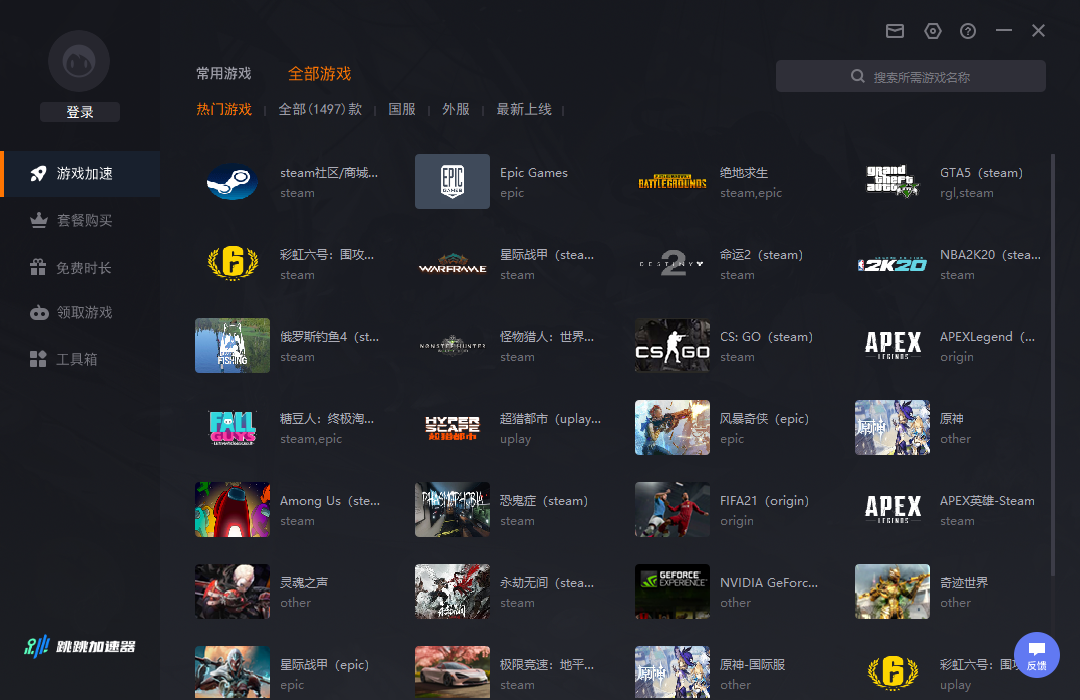 跳跳加速器支持千款游戏免费加速,多平台全方位支持,助力加速游戏体验,与全世界玩家酣畅对战;即时更新支持范围的网游,免费加速各类热门游戏,为游戏而生!华军软件园为您提供跳跳加速器下载,快来体验吧!