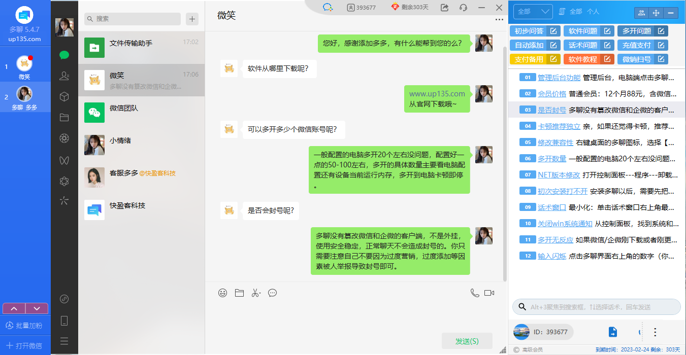 多聊软件是一款支持在电脑上免费多开微信的PC端工具,可以同时维护多个微信窗口聚合显示。多聊同时支持最新版的企业微信多开电脑版,安全稳定。此外还支持消息提醒、批量添加、图文话术一键回复等功能。