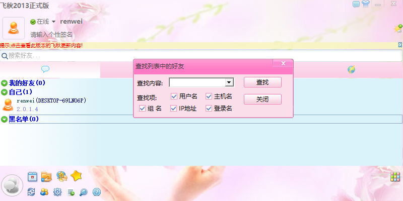 飞秋(FeiQ)是一款局域网聊天传送文件的绿色免费软件(目前不开源),它参考了飞鸽传书(IPMSG)和QQ, 完全兼容飞鸽传书(IPMSG)协议,具有局域网传送方便,速度快,操作简单的优点,同时具有QQ中的一些功能。飞秋(FeiQ)是一款局域网内即时通信软件,基于 TCP/IP(UDP)