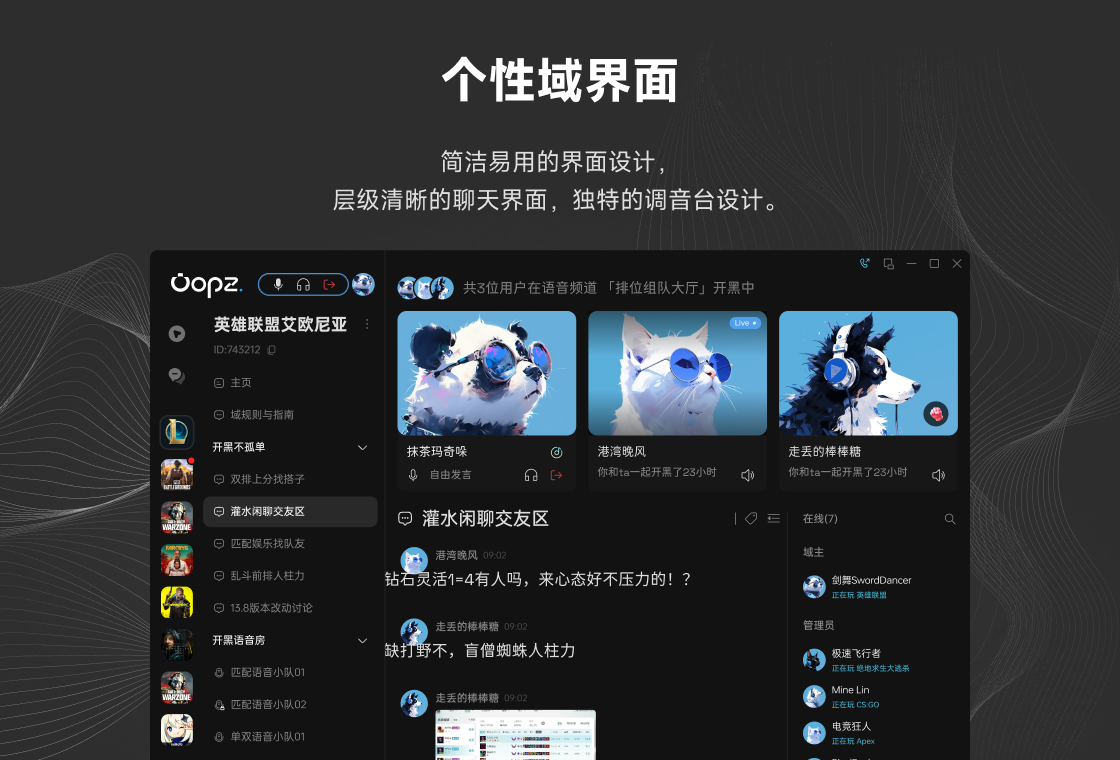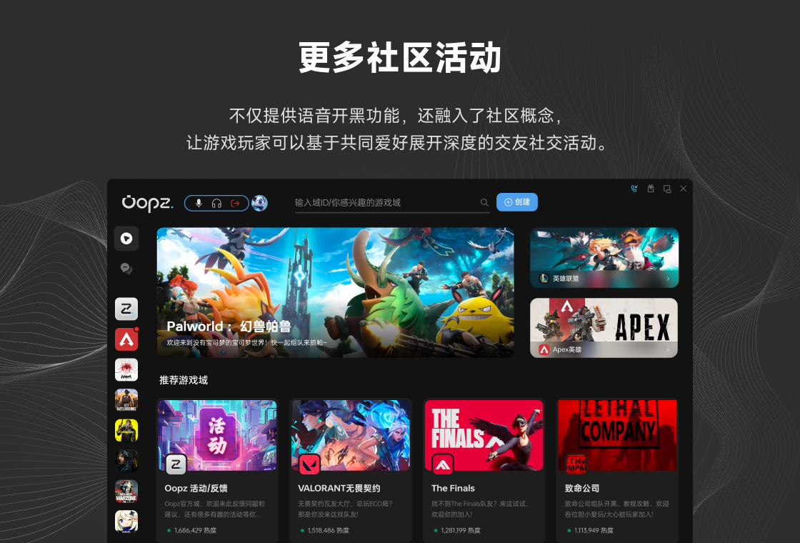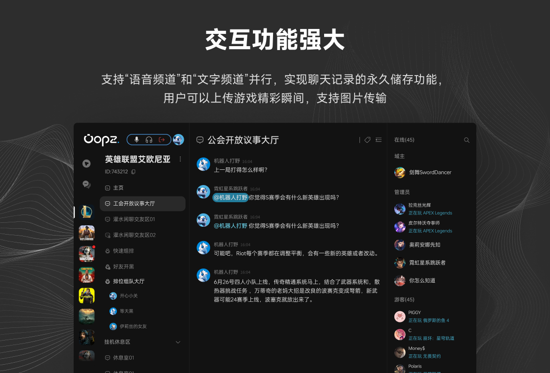 Oopz,一款游戏开黑语音工具。AI降噪强大、音质好、延迟低、简洁无广,致力于让游戏连接彼此,享受游戏开黑乐趣。Oopz能带给你什么:【语音通话】免费支持AI降噪,192kbps高质量语音、低延迟、回声消除等语音功能【极简高效】简洁无广告,交互体验Max,占用低,更舒适的游戏开黑体验【屏幕共享】支持1080P、60帧屏幕共享,随时随地与好友分享快乐“镜头”【多端互联】支持移动端与PC端(客户端/网页端)多端同时登录