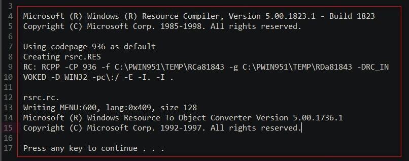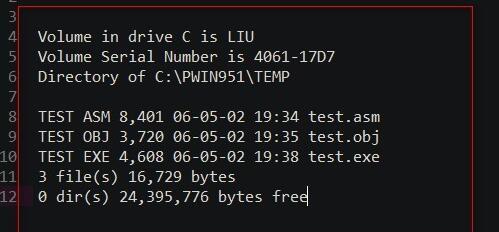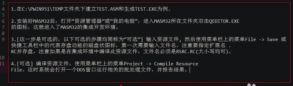 3.使用菜单栏上的菜单Project -> Assemblier ASM file。这时系统会打开一个DOS窗口运行相关的批处理文件。结束后会弹出一个名为“masm32binasmbl.txt”的窗口报告结果。报错如下信息