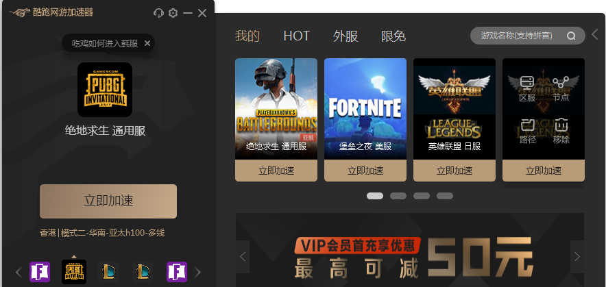 酷跑网游加速器是一款针对网游开发的,高稳定性的游戏加速器。酷跑网游加速器为游戏玩家提供美服、韩服、台服、日服、欧服、亚服等国际专线,支持绝地求生、lol、h1z1、csgo、steam等多款热门游戏加速,暂不提供手游和页游加速。