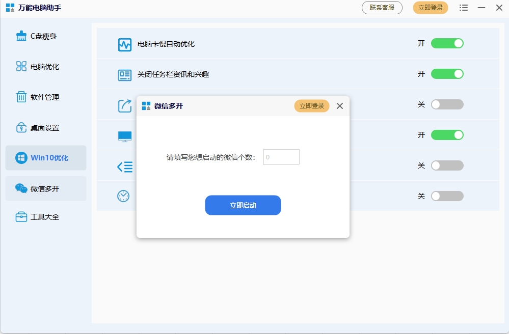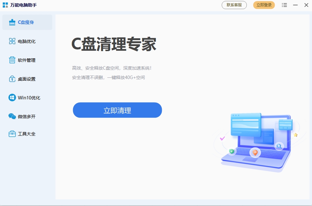 万能电脑助手一个好用的Windows优化助手,专注解决各种电脑问题,清理C盘垃圾、清理流氓软件、关闭Windows自动更新、修复网络异常、微信多开,为您的系统提供专项优化方案,持续为电脑保驾护航!