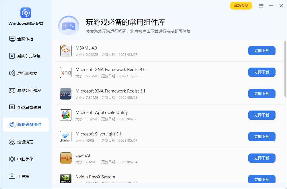 修复系统必备的常用运行库,解决因运行库缺失引起的dll丢失或程序无法运行等问题,包括C++运行库、.NET运行库、游戏库等的下载。