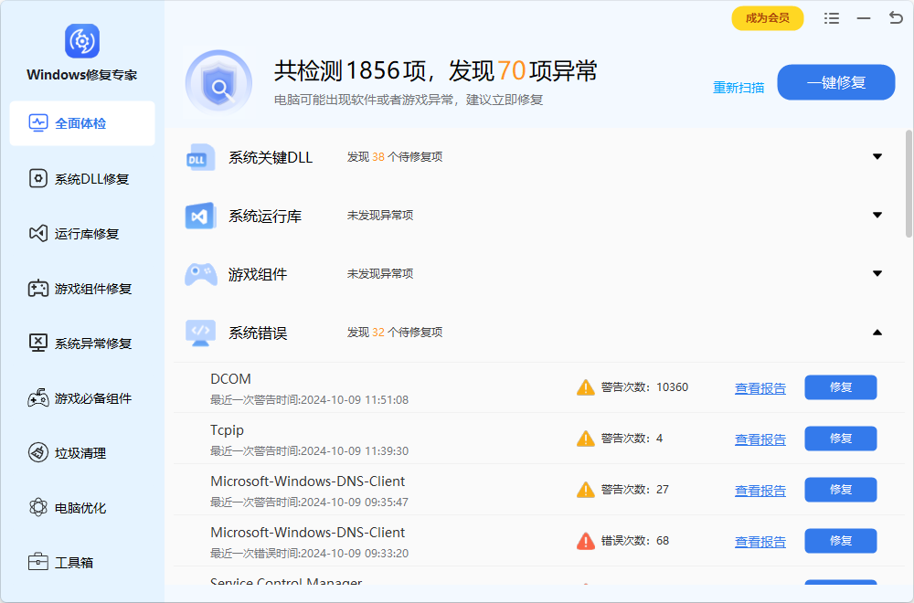 解决系统DLL文件异常问题,解决运行游戏或打开应用时提示dll文件缺失或损坏。