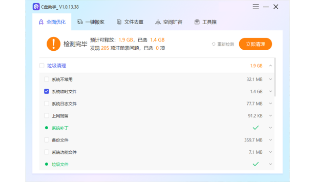 百贝C盘助手是一款功能十分强大的电脑磁盘清理软件,该软件采用了智能的扫描和清理技术,可以避免误删或误清理重要系统文件,确保系统的稳定性和正常运行,同时还可以自动识别并清理系统中的临时文件、回收站以及日志文件等无用缓存,从而大大提升电脑的运行速度,充分优化系统性能,有效地释放C盘空间,带给用户极佳的电脑使用体验。